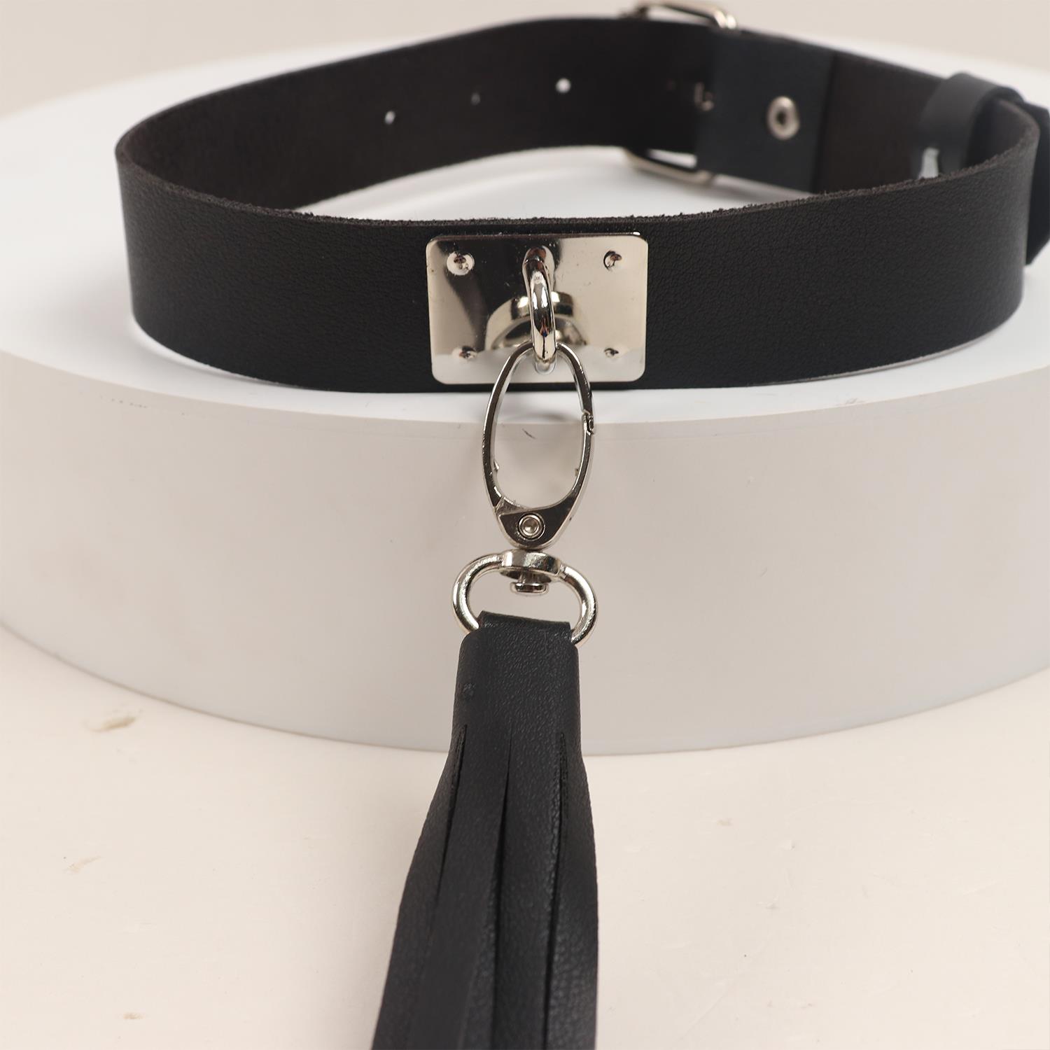 Şıklığı ve cesareti bir araya getiren bu deri choker harness kolye, zarif fırfır detayları ve metal halkalarla tasarlanmıştır. Boyun çevresine rahatça oturan ayarlanabilir kayışı sayesinde kişisel konfor sunar. Çıkarılabilir püskül aksesuarı, isteğe bağlı olarak farklı stillerle kombinlenebilir.