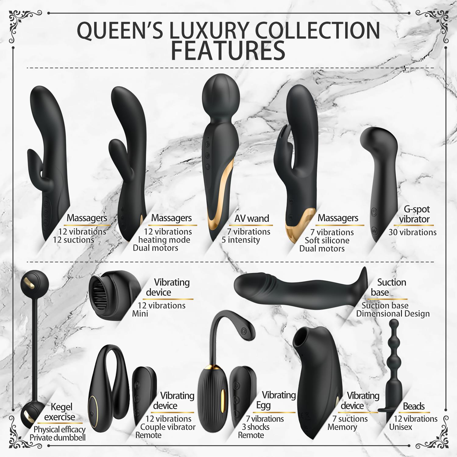 Pretty Love Queen’s Luxury Collection, çiftler için tasarlanmış 12 parçalık “altın detaylı siyah” premium bir keşif setidir. Tek bir kutuda; farklı uyarım stillerini (titreşim, emiş, ısıtma, uzaktan kumanda ve kegel egzersizi) bir araya getirerek her seferinde farklı bir deneyim oluşturmanıza yardımcı olur. Yumuşak silikon dokusu, suya dayanıklı gövdesi ve USB şarj özelliğiyle pratik ve uzun ömürlü kullanım hedefler. Set içindeki parçalar; klitoral uyarım, G-noktası odaklı masaj, çift kullanımı, kegel çalışması ve anal bölge için seçenekler sunar. İster “hafif ve romantik”, ister daha güçlü modlarla ilerleyin—seçim tamamen sizde.